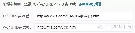 使用移动适配工具规则提交功能时,可以填写:http://www.a.com/([0-9]+)-([09]+).htm —→ http://m.a.com/${1}.htm