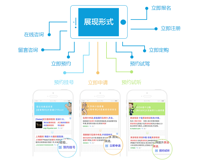基于网民在移动互联网时代的上网需求特征,百度移动搜索推广具有更加丰富的展现样式,这些样式将企业的业务直接在搜索结果中展现,客户通过点击样式,可直接参与企业业务的关键环节,省去了浏览企业官网等环节,有效提高了推广转化率,使客户与企业之间的交易达成更加容易。 展现样式包括:在线咨询(点击后弹出对话框,直接与客服在线即时交流)、留言咨询、立即报名(点击后弹出客户信息表单,客户填写基本个人信息)、立即注册、立即定购、预约挂号、预约试听、预约试驾、立即申请、立即预约等。如下图: