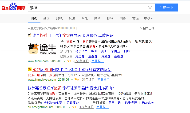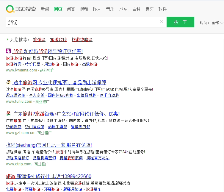 而就目前的国内搜索引擎而言,除百度外,还没有任何一家搜索引擎提出过“限制商业推广信息数量占比”的言论。但当面对商业利益和用户体验之间的取舍之时,我们很难不去选择前者。要知道即便前两天搜狗牵了微软的手,也没有对限制商业推广信息条数之多。以搜索关键词『旅游』为例,百度的商业推广链接数为3个,360是6个,而自诩要做高端搜索的搜狗则是8个。