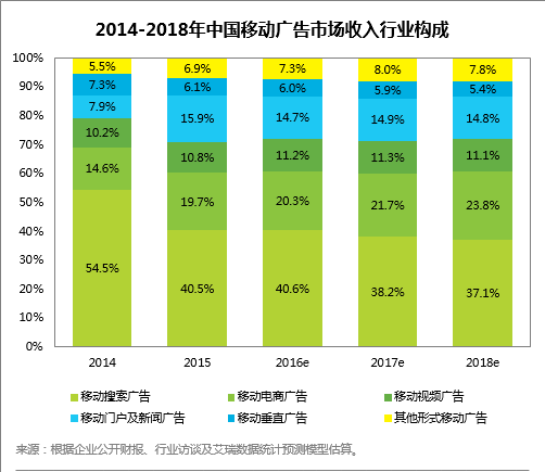 从不同细分市场来看,移动搜索广告为移动端份额最大的广告类型,2015年占比达40.5%,但其份额在近两年呈现出下滑趋势。移动电商广告、移动门户及新闻广告分别为移动端第二、第三大的广告类型,在2015年的占比分别为19.7%和15.9%。艾瑞预计,移动电商广告、移动视频广告在2016年将迎来规模上的增长,在移动广告中的占比将小幅增大。另外,其他形式如原生广告的规模和份额也将提升。移动营销总体结构分布情况,近几年将保持大体上的平衡。