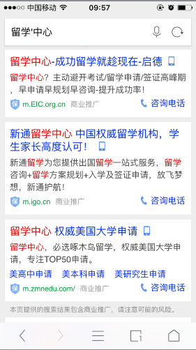 《办法》出台后,相关企业已经开始对照整顿。北京商报记者在百度输入“肾病医院”、“留学中心”等关键词搜索,排在前三位搜索结果,均有蓝色“商业推广”提示标识,点击商业推广,显示“本搜索结果为商业推广信息,请注意可能的风险”。