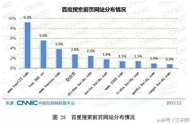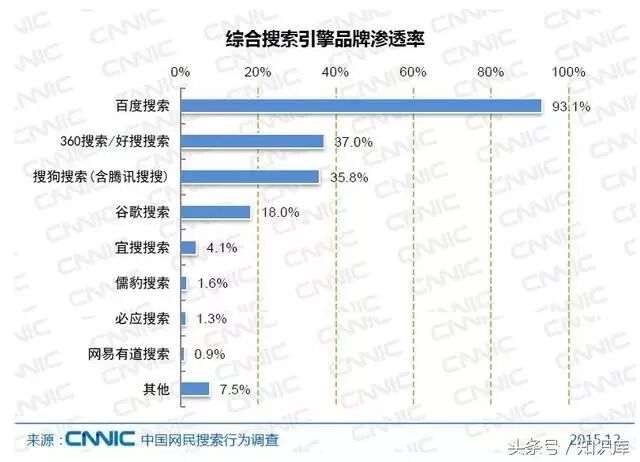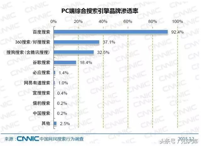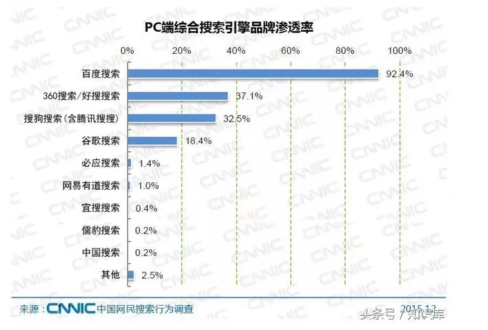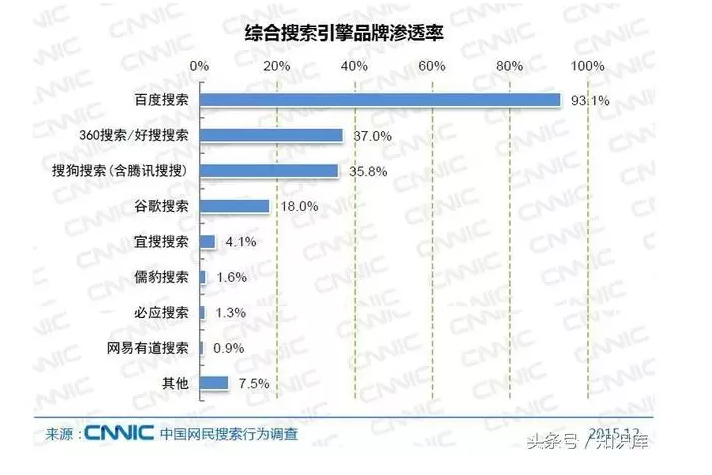截至2015年12月,百度搜索在搜索引擎用户中的渗透率为93.1%,其次是360搜索和搜狗搜索(含腾讯搜搜),渗透率分别为37.0%和35.8%。
