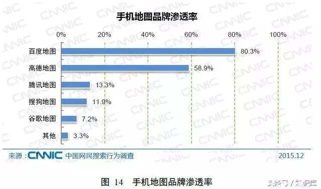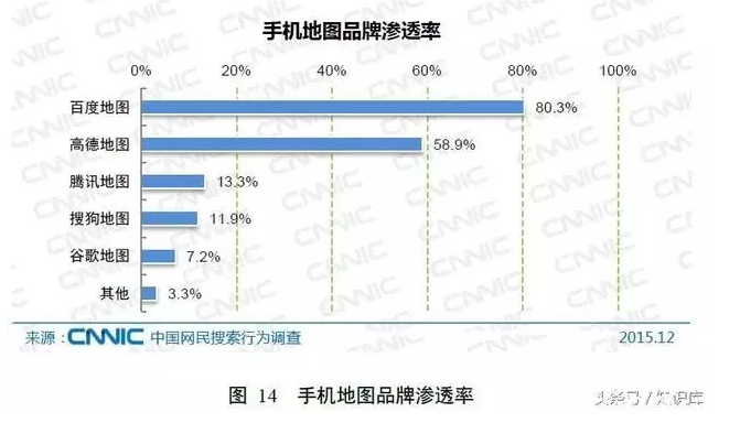 截至2015年12月,在手机地图搜索用户中,百度地图的品牌渗透率为80.3%,高德地图位列第二,为58.9%。
