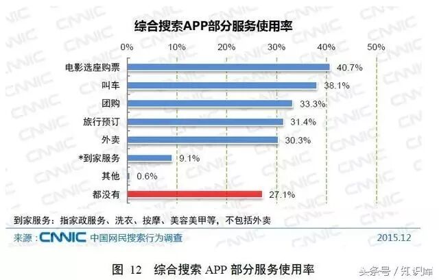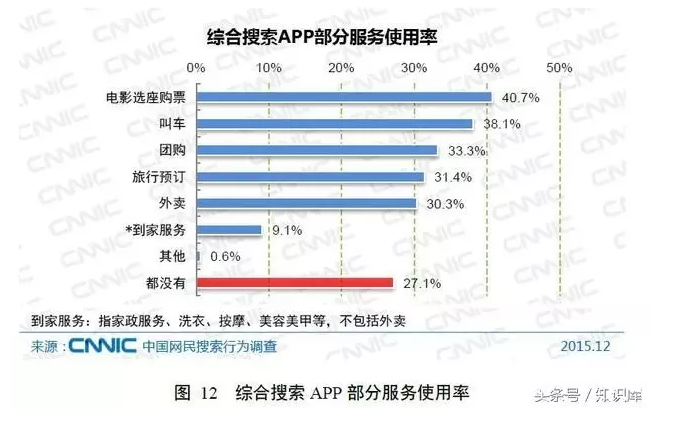 截至2015年12月,手机综合搜索引擎用户中,使用过百度搜索APP的用户比例达68.3%,使用过360搜索/好搜搜索APP和搜狗搜索(含腾讯搜搜)APP的比例分别为8.2%和6.6%;使用过综合搜索APP的用户,使用电影选座购票和叫车服务的比例分别为40.7%和38.1%,使用团购、旅行预订与外卖服务的比例也超过三成。
