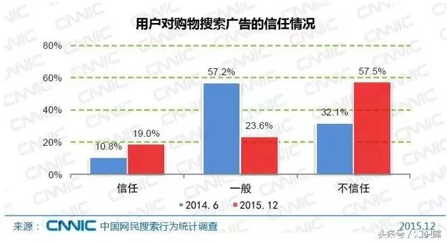 截至2015年12月,有70.6%的购物搜索用户注意到了购物搜索结果中的推广信息或广告;表示信任购物搜索广告的用户比例为19.0%,不信任的比例为57.5%。