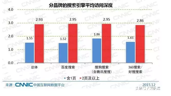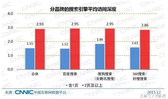 2015年,搜索引擎站内访问深度平均为1.55页,搜狗搜索(含腾讯搜搜)平均每次访问会点击1.86个页面,360搜索、百度搜索的平均页面访问深度分别为1.61、1.52;剔除仅访问一个页面的情况,搜索引擎站内访问深度平均为2.93个页面,百度搜索、搜狗搜索(含腾讯搜搜)的平均访问深度为2.95个页面,360搜索为2.86个页面。