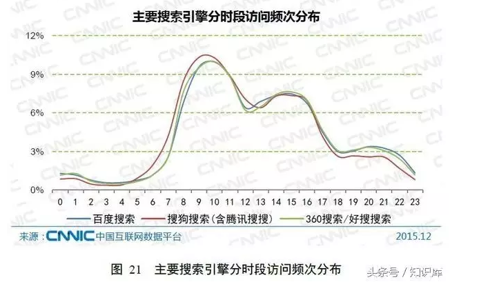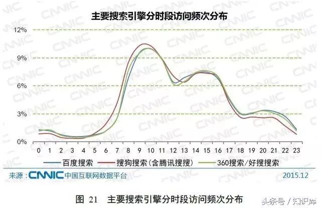 2015年,百度搜索主页、360搜索主页的70%的访问量高峰出现在8点至16点间,搜狗搜索(含腾讯搜搜)主页则在7点至15点间;用户从跳入到跳出同一搜索引擎页面,平均花费34.0秒。