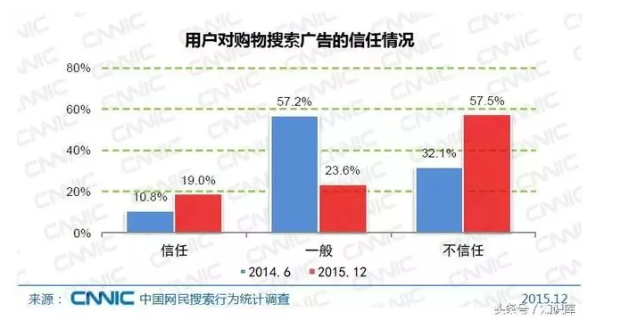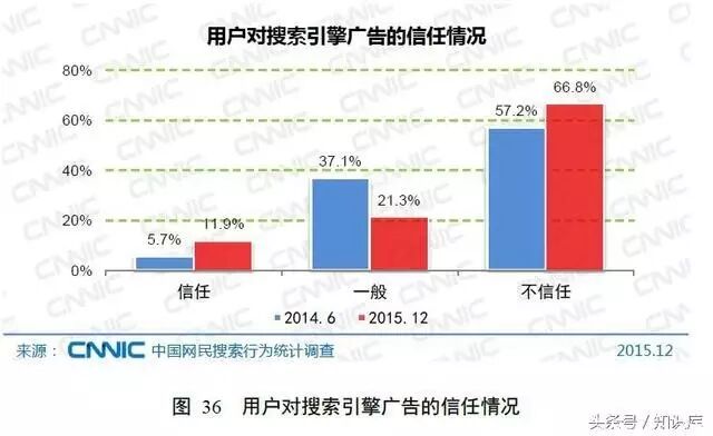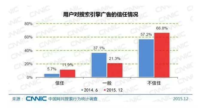 截至2015年12月,有69.9%的搜索用户注意到了搜索结果中的推广信息或广告;表示信任搜索引擎广告的用户比例为11.9%,不信任的比例为66.8%。