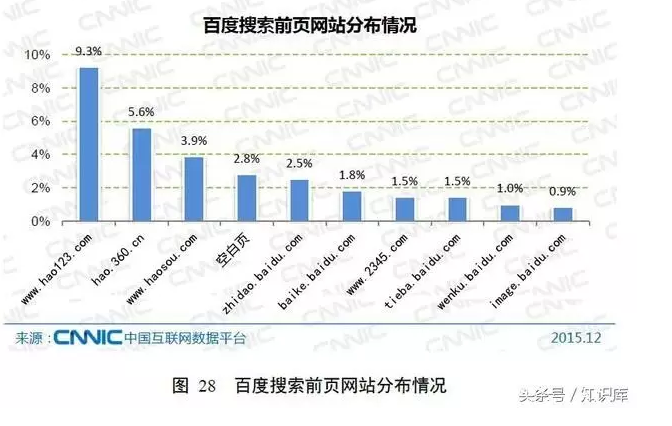 截至2015年12月,PC搜索用户使用综合搜索网站的比例达95.0%;PC端搜索引擎用户中,百度搜索的使用比例为92.4%,360搜索、搜狗搜索(含腾讯搜搜)分别为37.1%和32.5%。