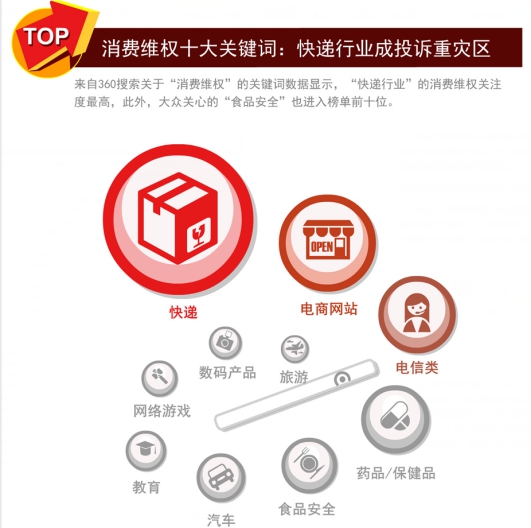 国际消费者权益日即将到来,去年315晚会上将黑心外卖等侵犯消费者权益的问题逐一曝光,那么今年那些行业企业又将“榜上有名”呢。近日,2017年《中国互联网用户消费维权报告》(下称“报告”)出炉,360搜索对用户最爱维权的十大热点问题做出了统计。数据显示,快递、电商等行业已成消费侵权行为发生重灾区。