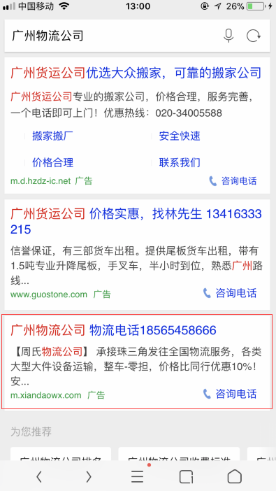广告模式:搜索引擎推广,CPC,手机端推广