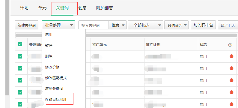 关键词访问网址可以在推广计划的关键词栏目里面设置,在里面有一个批量处理栏目,点击批量处理栏目后可以看到一个修改目标网址的栏目点击那里就可以设置关键词URL。