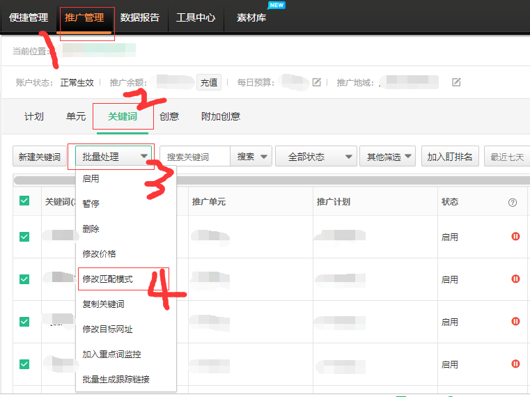 点击进入神马搜索推广后台推广管理这个栏目,然后在点击关键词这个栏目就可以看到一个批量处理栏目点击进去就看到修改匹配模式这个栏目。点击全选中所有关键词再点击修改匹配模式这个栏目就可以设置关键词匹配模式了。如下图: