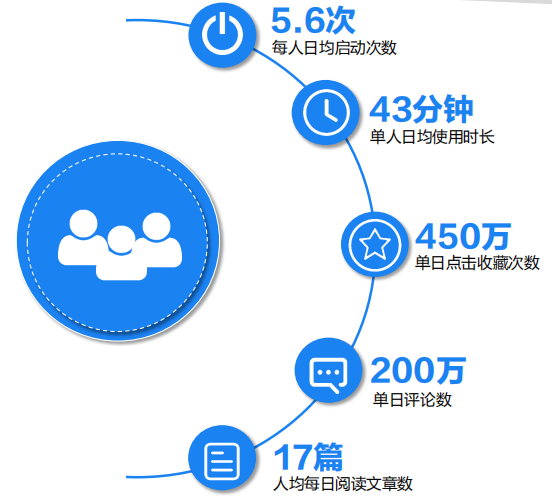 用户规模6.85亿占比59.5%,在新闻资讯应用排名第三,月活跃用户1.4亿,曰活跃用户4800万,一点资讯安装量2.7亿。人均每天使用时长55分钟。